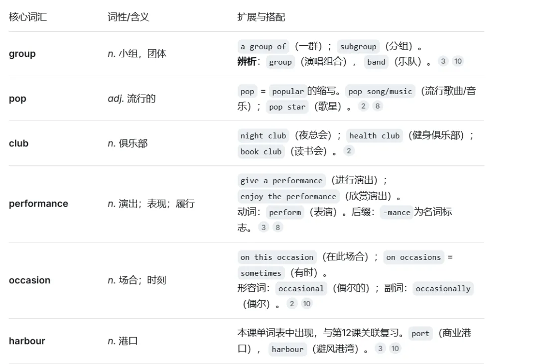 词汇辨析:group(组合)vs. band(乐队);visit(巡演/参观);occasion(场合)的介词搭配