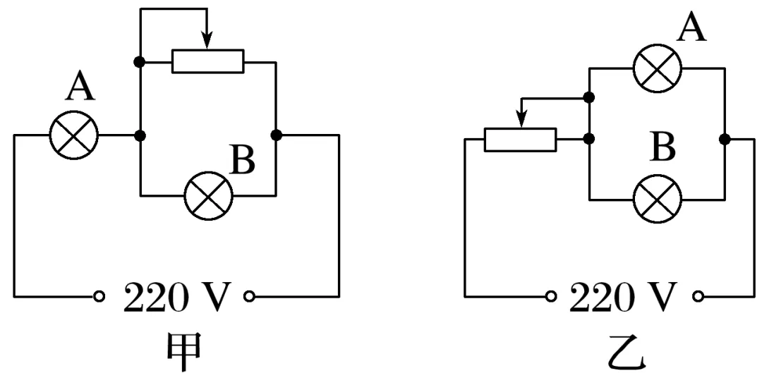 A、B两灯的额定电压都是110 V,A灯的额定功率PA=100 W,B灯的额定功率PB=40 W,若将两灯同时接入电压恒为220 V的电路中,且使两灯均能正常发光,同学们设计了如图甲、乙所示的两种电路,则甲、乙两电路消耗的电功率之比为( )