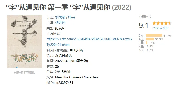 西汉刘安的《淮南子·本经训》:“昔者仓颉作书,而天雨粟、鬼夜哭。”可见汉字的魔力。纪录片《“字”从遇见你》是一个从小小汉字窥探古代中国文化密码的纪录片系列。该片通过对沉淀于历史深䆳处的造字情景进行轻松、愉悦的揭秘,让观众获得硬核的文字考古学知识,受到中国古典文化的美妙熏陶。