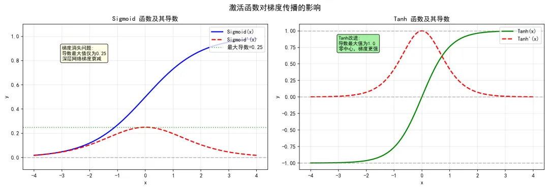 梯度对比注意:当使用Sigmoid作为激活函数时,深层网络的梯度会逐层衰减,导致靠近输入层的权重几乎无法更新。