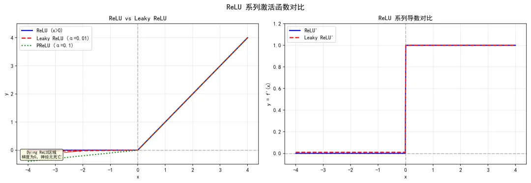 - • ❌ Dying ReLU问题:负区间梯度为0,可能导致神经元"死亡"