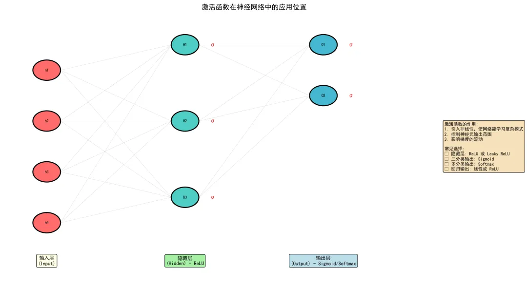 ├── 隐藏层 → 使用 ReLU 或 Leaky ReLU