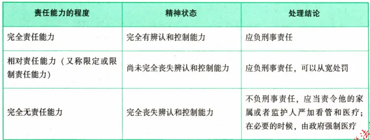 1.间歇性精神病人:精神正常时属于完全责任能力,应负刑事责任;发病期间丧失责任能力,不负刑事责任。