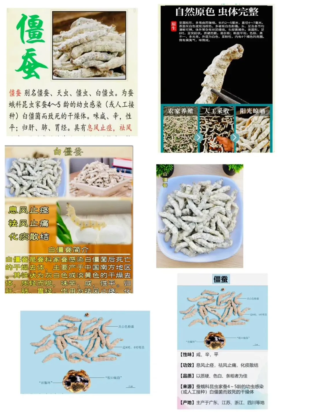 5.僵蚕:注意与病死蚕(无白霜)和伪造品(石膏模型)区分,“断面四个亮环”是关键。