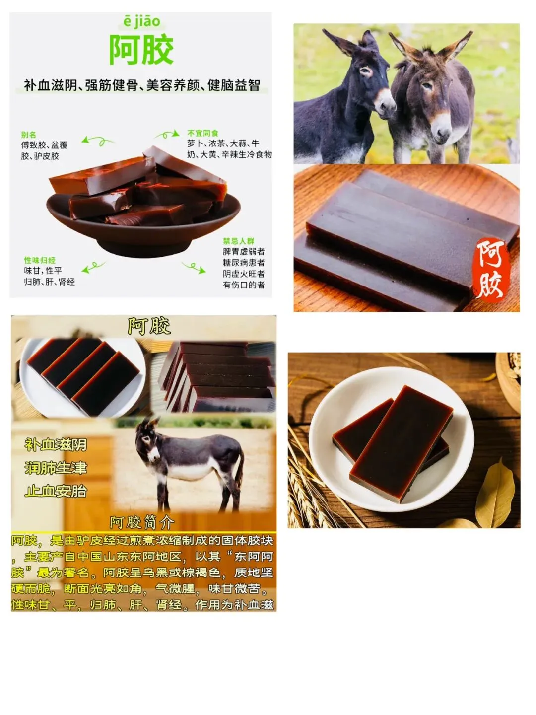 ①来源:马科动物驴的皮经煎煮、浓缩制成的固体胶。