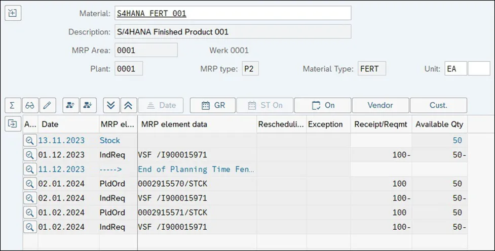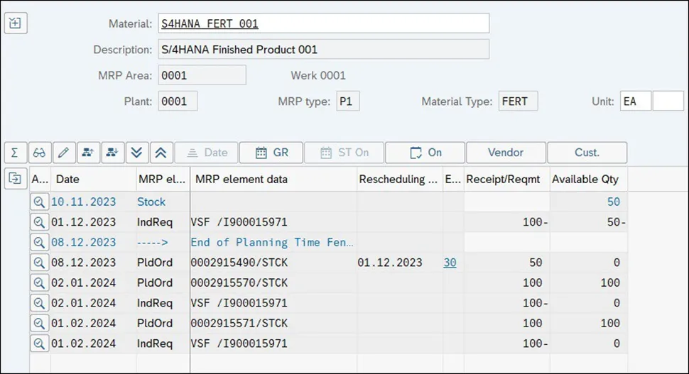 下图显示了使用 MRP 类型 P1 和 20 个工作日的计划时界时的 MRP 结果。对应于 End of Planning Time Fence 的蓝线标识 20 天期间的结束时间。2023 年 12 月 1 日的 100 EA 的独立要求在时限内,导致 50 EA 短缺,但 MRP 仅在同一天创建了一个新的计划订单,以便在 2023 年 12 月 8 日超出时限。第二天,时界将移至 2023 年 12 月 9 日,此计划订单将自动确认,因为它现在位于时界内。
