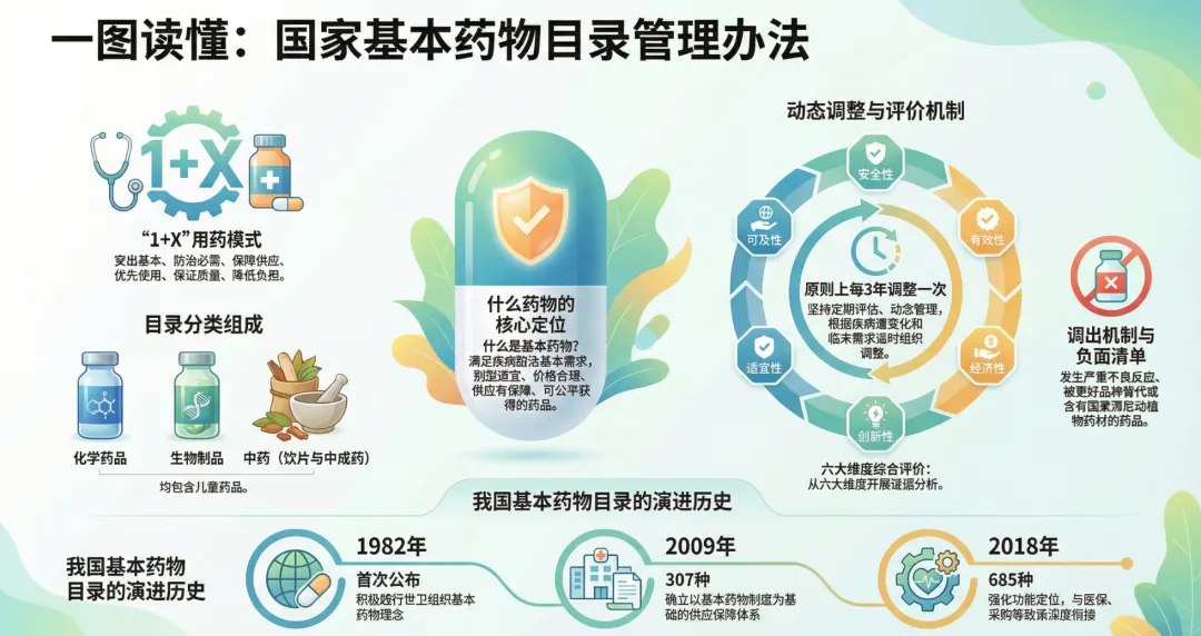 在医疗需求日益多元化的今天,普通百姓常陷入一种深刻的“药柜焦虑”:是追求昂贵的“进口新药”,还是信任老牌的“便宜药”?为什么有些曾被奉为“神药”的品种会突然消失,而有些药品却能跨越四十年长盛不衰?这种焦虑的背后,是对“买药难、药价贵、选药乱”的现实关切。事实上,自1982年中国首次公布基本药物目录以来,这一制度已从单纯的“低价清单”演变为守护14亿人健康主权的安全网。2009年的深改更是确立了其作为国家医药卫生体制改革基石的地位。“国家基本药物目录”绝非一张简单的报销凭证,它是一套融合了循证医学、价值医疗与国家供应安全的复杂系统,承载着国家对每一位公民的健康承诺。