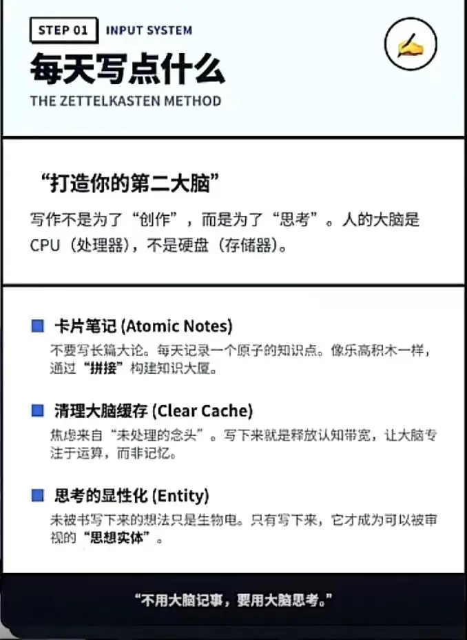 - 首先第一件事,就是每天写点什么。我们一定要知道,我们的大脑是用来思考的,可以说写作是我们的第二系统。为什么?因为大脑首先是用来思考的,它不是是用来存储的。我们很多时候的理解是错的,就是我们从小的学习就是把很多东西记到脑子里,我们认为那个就是我的。不是的,因为大脑是一块肥肉,它的主要功能是用来计算,是用来思考,不是用来存储。尤其在移动互联网时期,在 AI 时期,很多东西都是可以查到的。所以我们一定要让大脑用来思考。那么一个很重要的事就是把很多临时的想法把它写出来,这样可以清理我们的缓存,让我们大脑可以专注做它应该干的事。