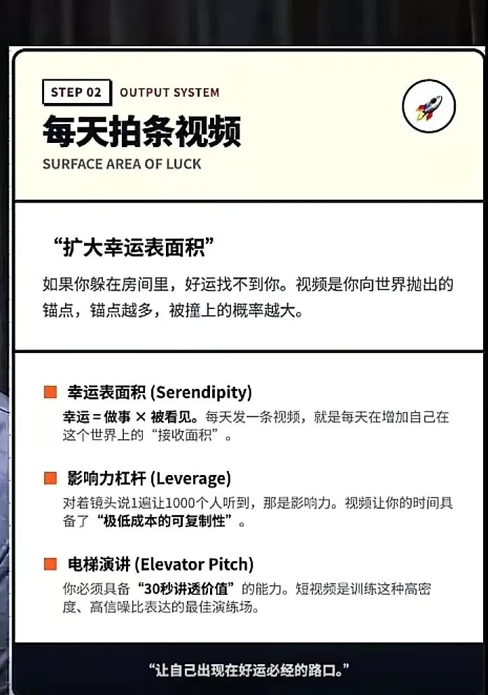 - 这三个单独的系统融合在一起,就变成一套飞轮。什么飞轮?比如你从每天写点什么,形成知识晶体、洞见、对世界的理解,然后通过每天拍条视频,用短视频把它放大。没有每天写点什么,短视频是缺乏深度的;但有了短视频,给内容增加了广度。就好像你知道一个东西的解法,但没人知道,你通过视频让很多人知道,就有了幸运表面积。这就是这个时代创富的重要东西 —— 杠杆,个人能力有限,但有了杠杆,相当于创造了 n 多个分身。比如你分享只有两三个人能听,我一分享可能上百万人能听到,咱俩的幸运表面积不一样。