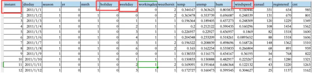 - holiday(是否节假日)→ 相关性非常低,是不是节假日对当天租车量影响很小。