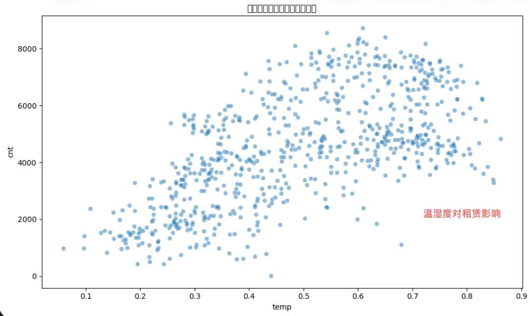 - 当温度(横轴)从 0.1 向 0.6 升高时,租赁量(纵轴)整体呈现明显的上升趋势,从几百次 / 天增长到 8000+ 次 / 天。