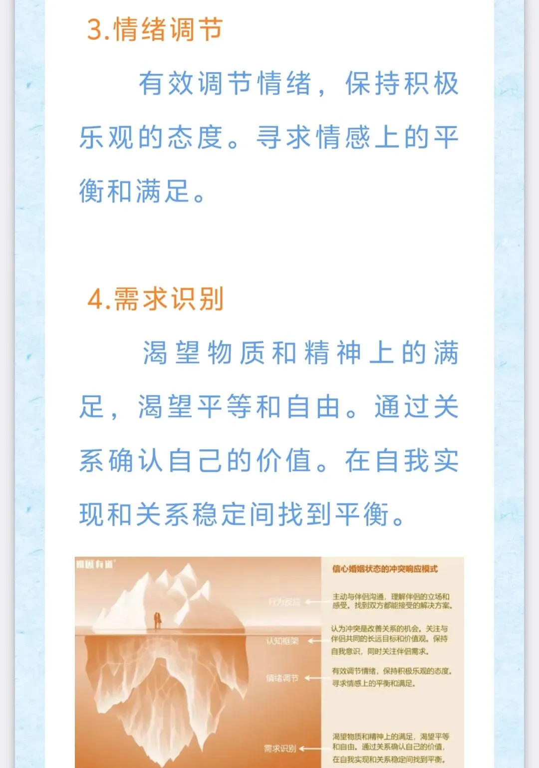 通过学习《“信心婚姻”状态的识别》这课,我意识到自己的婚姻离进入“信心婚姻”的状态还需要有进一步“跨越”。在课上的案例分析中,虽然客户遇到同样是“婚外情”状况,但是客户在处理婚姻问题的“行为模式”不一样,“情绪调节”过程中也是不一样的。所以当我们在处理问题的时候需要保持冷静,首先让自己思考明确自己的需求是什么?我们究竟想要什么样的婚姻?……