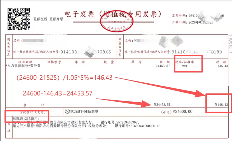 | 差额扣除 | 扣除项目:代付的员工工资、福利、社保、公积金。扣除凭证:需合法凭证。开票限制:代付部分不得开专票。 | 扣除项目:同左。扣除凭证:要求更严,需“三流一致”,留存备查。开票模式:通过“差额征税”功能开具,代付部分税额为0。 |