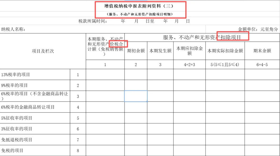 (一)本表由服务、不动产和无形资产有扣除项目的营业税改征增值税纳税人填写。其他纳税人不填写。(二)“税款所属时间”“纳税人名称”的填写同主表。(三)第1列“本期服务、不动产和无形资产价税合计额(免税销售额)”:营业税改征增值税的服务、不动产和无形资产属于征税项目的,填写扣除之前的本期服务、不动产和无形资产价税合计额;营业税改征增值税的服务、不动产和无形资产属于免抵退税或免税项目的,填写扣除之前的本期服务、不动产和无形资产免税销售额。本列各行次等于《附列资料(一)》第11列对应行次,其中本列第3行和第4行之和等于《附列资料(一)》第11列第5栏。营业税改征增值税的纳税人,服务、不动产和无形资产按规定汇总计算缴纳增值税的分支机构,本列各行次之和等于《附列资料(一)》第11列第13a、13b行之和。(四)第2列“服务、不动产和无形资产扣除项目”“期初余额”:填写服务、不动产和无形资产扣除项目上期期末结存的金额,试点实施之日的税款所属期填写“0”。本列各行次等于上期《附列资料(三)》第6列对应行次。本列第4行“6%税率的金融商品转让项目”“期初余额”年初首期填报时应填“0”。(五)第3列“服务、不动产和无形资产扣除项目”“本期发生额”:填写本期取得的按税法规定准予扣除的服务、不动产和无形资产扣除项目金额。(六)第4列“服务、不动产和无形资产扣除项目”“本期应扣除金额”:填写服务、不动产和无形资产扣除项目本期应扣除的金额。本列各行次=第2列对应各行次+第3列对应各行次。(七)第5列“服务、不动产和无形资产扣除项目”“本期实际扣除金额”:填写服务、不动产和无形资产扣除项目本期实际扣除的金额。本列各行次≤第4列对应各行次,且本列各行次≤第1列对应各行次。(八)第6列“服务、不动产和无形资产扣除项目”“期末余额”:填写服务、不动产和无形资产扣除项目本期期末结存的金额。本列各行次=第4列对应各行次-第5列对应各行次。