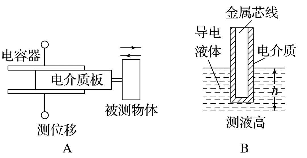 (2023·南昌市高二期中)传感器是自动控制设备中不可缺少的元件,已经渗透到宇宙开发、环境保护、交通运输以及家庭生活等各个领域。几种电容式传感器如图所示,其中通过改变电容器两极板间的距离而引起电容变化的是( )