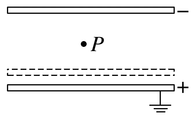 一平行板电容器充电后与电源断开,正极板接地,在两极板间有一正电荷(电荷量很小)固定在P点,如图所示,以E表示两极板间的电场强度,U表示电容器的电压,Ep表示正电荷在P点的电势能。若保持负极板不动,将正极板移到图中虚线所示的位置,则( )