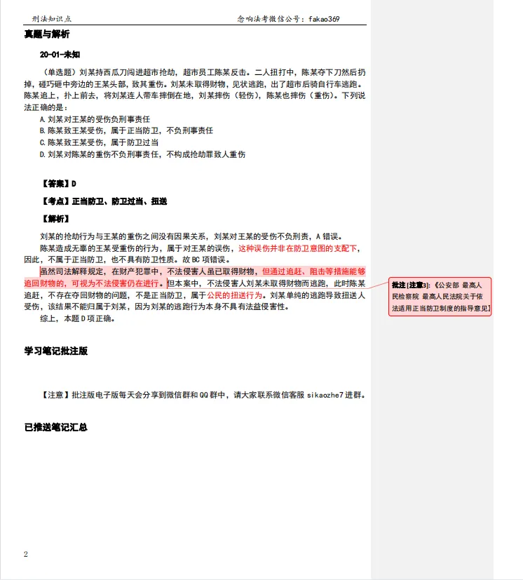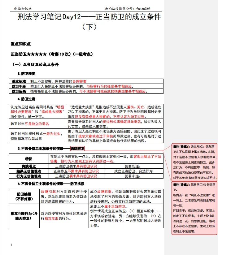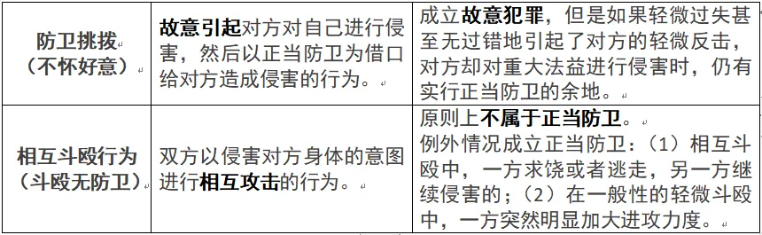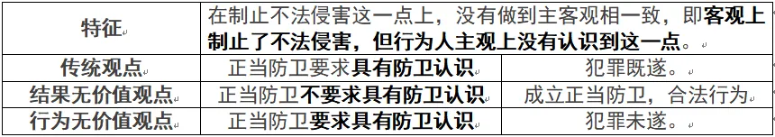 |「正当防卫★★★★★(考察10次)(一级考点)」【注意】通说观点:偶然防卫在不法层面上属正当防。亦即,对于造成不法侵害人损害的结果,在不法层面上属正当防卫,是合法行为,不构成犯罪。当然,如有造成其他法益侵害的可能性,对于其他危害结果可能构成不法。相同点:在“制止不法侵害”这一句上,二者都没有做到主客观相一致。区别在于:偶然防卫是,客观上制止了不法侵害,主观上没有认识到这一点。假想防卫是,客观上不存在不法侵害,主观上以为在制止不法侵害。6.不具备防卫主观条件的情形——防卫挑拨
