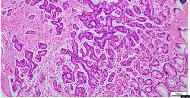 - HE 切片足够时,可观察到两种细胞特征:异型度低 + 结构异型 + 浸润性生长(癌)