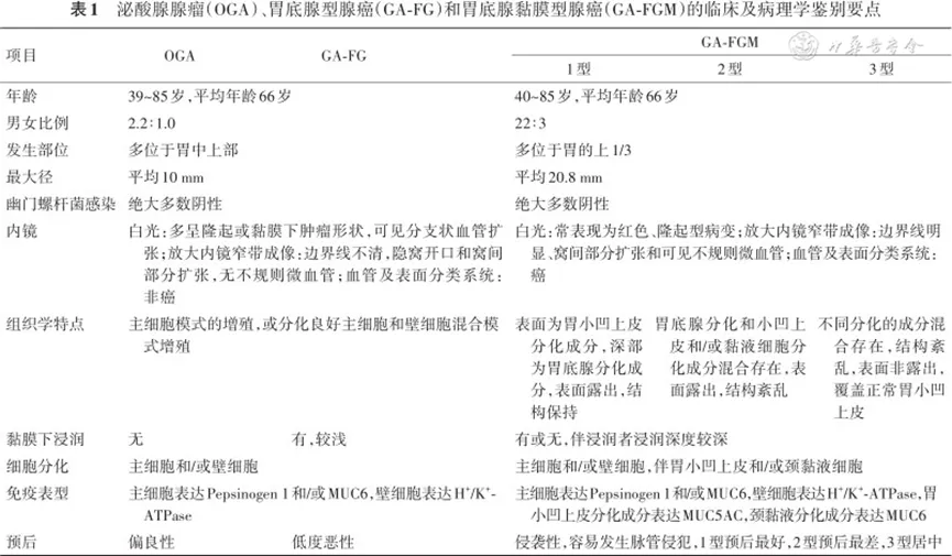 表1泌酸腺腺瘤(OGA)、胃底腺型腺癌(GA-FG)和胃底腺黏膜型腺癌(GA-FGM)的临床及病理学鉴别要点