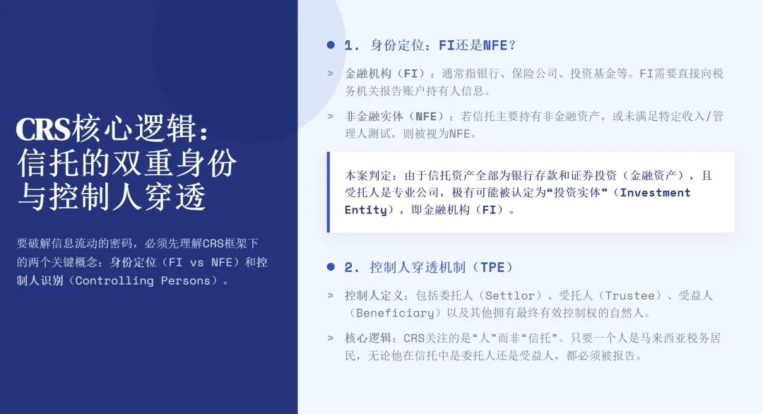 - 角色: 开曼群岛在本案中主要扮演两个角色:一是作为信托的居民国,接收关于信托本身账户的次要信息;二是如果信托选择成为金融机构,则开曼将成为核心的报告管辖国,负责收集信息并交换给马来西亚等国