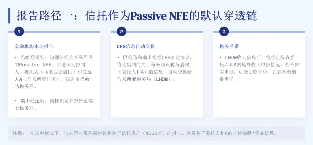 - 对下游机构的影响: 巴哈马银行和瑞士经纪商此时仅需将信托视为一个金融机构客户,报告其账户总况给巴哈马和瑞士当局,再由后者交换给开曼当局。它们不再需要穿透识别和报告委托人与A的信息。报告责任从巴哈马/瑞士的金融机构,转移到了开曼的信托本身