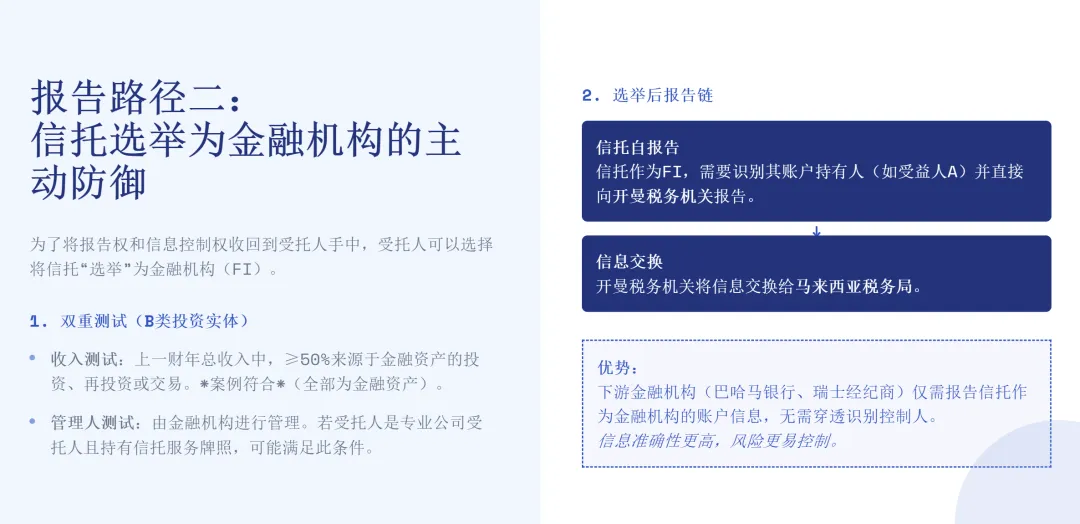 - 直接报告: 信托需要识别这些账户持有人的税务居民身份。对于马来西亚居民(委托人和A),信托需要直接向开曼群岛税务机关报告他们的账户信息