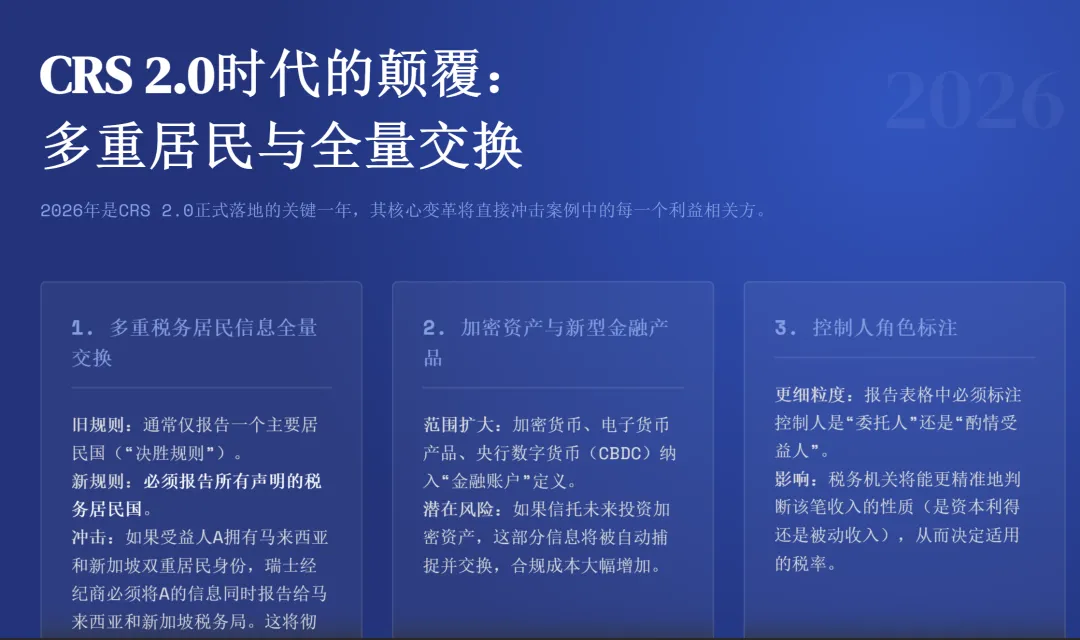 今天是2026年2月12日,正值CRS重大升级——CRS 2.0开始实施的关键节点。这一变革将对我们案例中的多司法管辖区信托产生深远影响。4.1 CRS 2.0的核心升级点