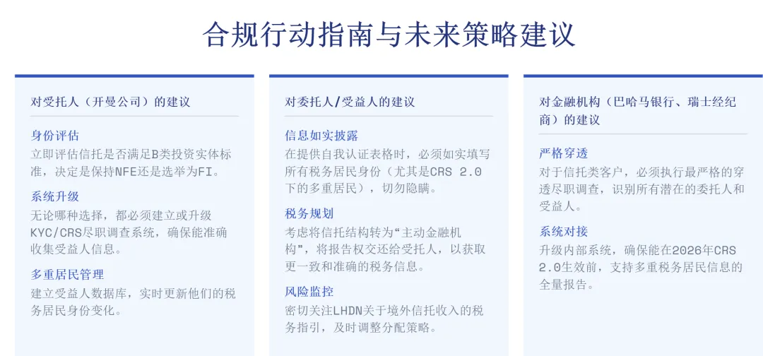 - 明确身份定位: 立即评估信托在CRS下的分类(是保持为Passive NFE,还是积极申请成为Type B Investment Entity)。这需要结合开曼群岛最新法规和税务意见