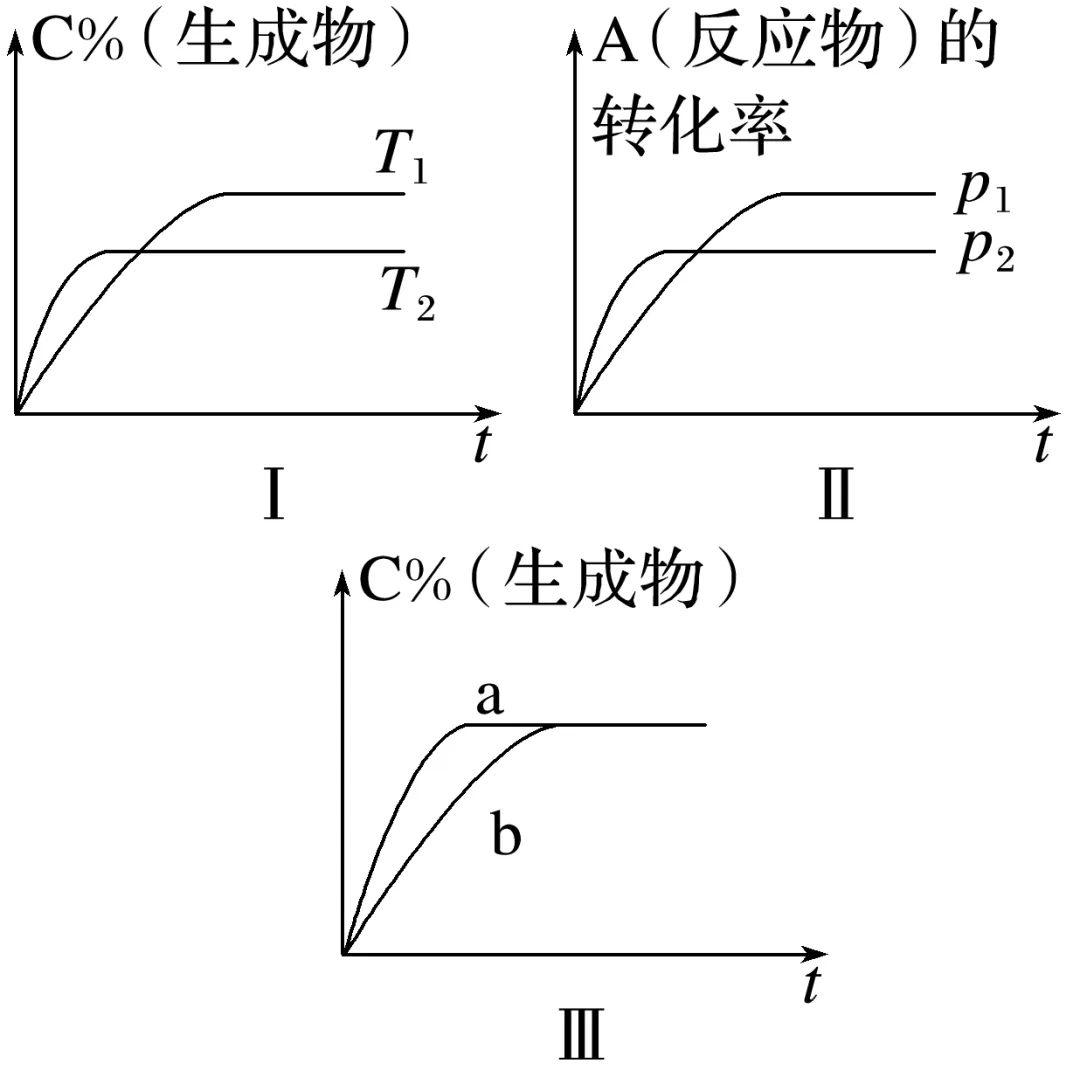 (1)图Ⅰ表示T2___T1,正反应是______反应,温度升高,平衡______移动; (2)图Ⅱ表示p2___p1,压强______,A的转化率减小,平衡逆向移动,说明正反应是气体总体积______的反应; (3)图Ⅲ中生成物C的百分含量不变,说明平衡不发生移动,但反应速率a___b,故a可能使用了___;也可能该反应是反应前后气体总体积不变的可逆反应,a___了压强(压缩体积) |