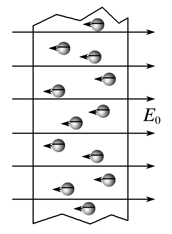如图所示,不带电的金属导体放到电场中,导体内的自由电子将发生定向移动,使导体两端出现等量异种电荷。请思考下列问题: