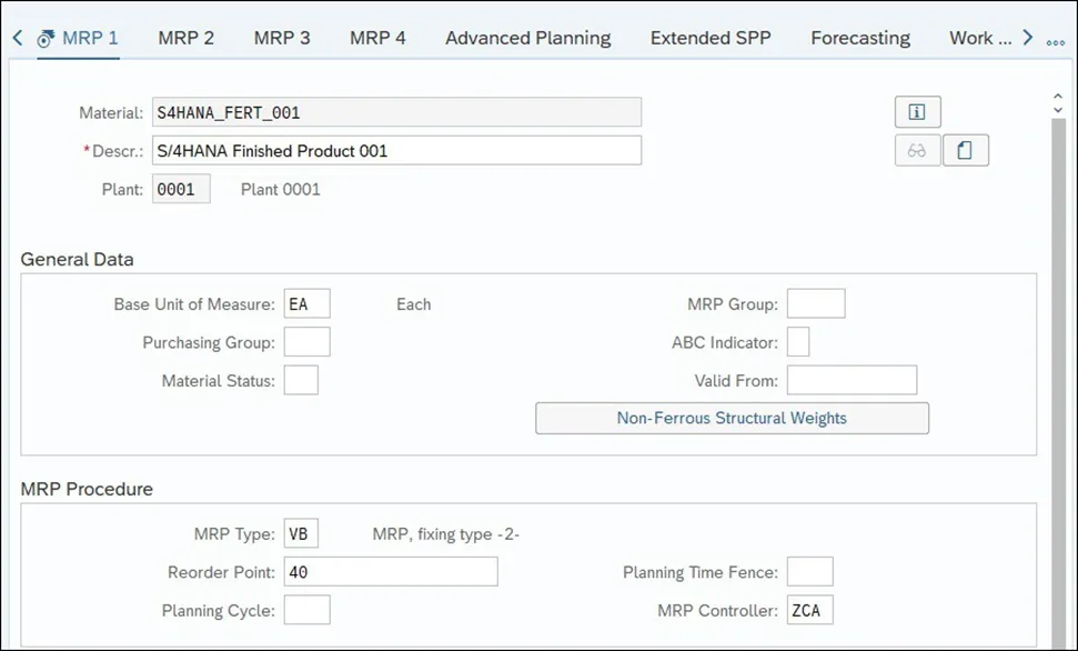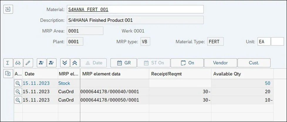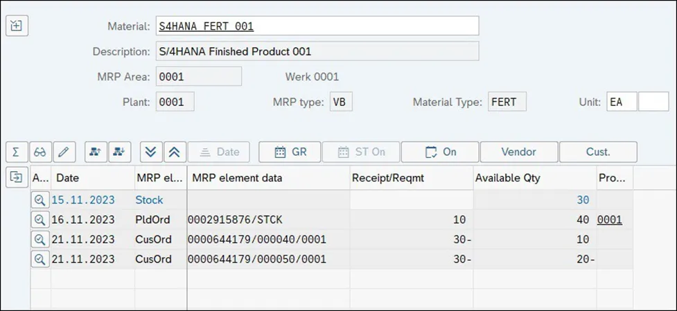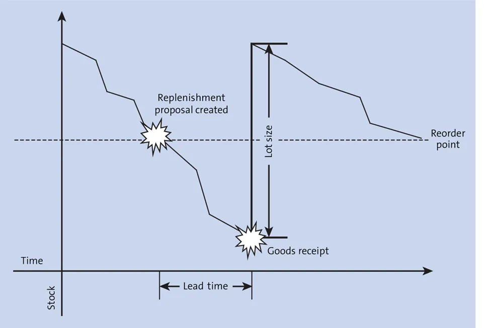 标准 SAP S/4HANA 安装中提供了三种不同的基于消费的 MRP 类型:我们首先谈谈再订货点计划程序。使用这种 MRP 程序,需要定义再订货级别,可以在物料主数据中手动定义,也可以由系统自动定义。对于发布到具有此 MRP 类型的物料的每个发货,SAP S/4HANA 会将当前库存水平与再订货点进行比较,并在库存低于再订货点时触发补货。 下图说明了具有 MRP 再订货点的材料库存水平。在此图表中,库存逐渐消耗,直到达到再订购级别。一旦达到再订购级别,MRP 就会触发补货。补货提前期过后,库存将恢复到原始水平。SAP S/4HANA 为再订货点程序提供不同的 MRP 类型;其中,最简单的是 MRP 型 VB。使用此基本再订货点 MRP 类型时,需要在物料主数据中手动输入再订货点。下图显示了物料主数据的 MRP 1 选项卡,可以在其中同时定义 MRP 类型和再订购点。在此示例中,已为物料定义了 40 EA 的再订货点,这意味着一旦库存水平低于 40 EA,MRP 将创建新的补货提案。确定材料再订货点的一种非常常用的方法是使用材料的平均每日消耗量与其交货时间的乘积。为避免因补货延迟而导致短缺,可以向再订货点添加少量商品,以表示安全库存。现在,我们来分析一个具有物料 S4HANA_FERT_001、MRP 类型 VB 和物料主数据中定义的 40 EA 的手动再订购点的示例。下图显示了物料的 MRP 运行后的库存和需求情况。当前库存水平为 50 EA,有两个不同的 30 EA 销售订单。请注意,MRP 没有为材料创建任何新的补货建议,因为当前库存水平高于再订购点水平。“可用数量”列,可以看到导致负可用数量的预测需求,这在使用确定性 MRP 时触发了补货。在下图中,现在请注意,有两个销售订单会导致 2023 年 11 月 15 日出现短缺,但 MRP 没有对这种短缺做出反应。这是因为在使用 MRP 类型 VB 时,这些销售订单与 MRP 计算无关。MRP 将比较库存与再订货点,并且仅比较具有再订货点的库存,在净需求计算过程中不考虑任何需求。现在假设物料的库存/需求情况已更改,并且已发布 20 EA 的发货。库存现在下降到 30 EA,低于物料主数据中定义的再订购点。下图显示创建了一个 10 EA 的新计划订单,使可用数量高于再订货点水平。为简化起见,我们在此示例中使用批量大小程序 EX,以便 MRP 生成具有确切缺失数量的新补货提案。然而,在现实生活中,这种再订货点与批量大小程序 EX 的组合通常是不可取的,因为它会非常频繁地触发补货。再订货点 MRP程序经常与批量大小程序一起使用,该程序补充到最大库存水平或最小或固定批量大小,以避免频繁补货。虽然 MRP 类型 VB 在计算过程中不会考虑补货要素,但再订货点程序有一些标准的 MRP 类型,这些类型将在计算过程中考虑外部要求。例如,标准 MRP 类型 V1 将在净需求计算期间考虑补货提前期内的外部需求。在这种情况下,MRP 不仅会将当前库存与再订货点水平进行比较,还会考虑补货时间内的任何销售订单。 让我们回到前面的例子,在这个例子中,我们有 50 个 EA 的库存和两个 30 个 EA 的物料S4HANA_FERT_001销售订单。考虑到我们为材料添加了 10 个工作日的内部生产时间,这些销售订单将在补货提前期内,并且 MRP 将在计算净需求时考虑这些时间。你若喜欢,点个❤️谢先👇