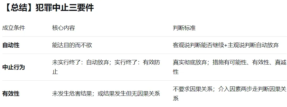 3.不成立中止的情形:防止措施不具有防止结果发生的可能性;未真诚努力去完成防止措施。