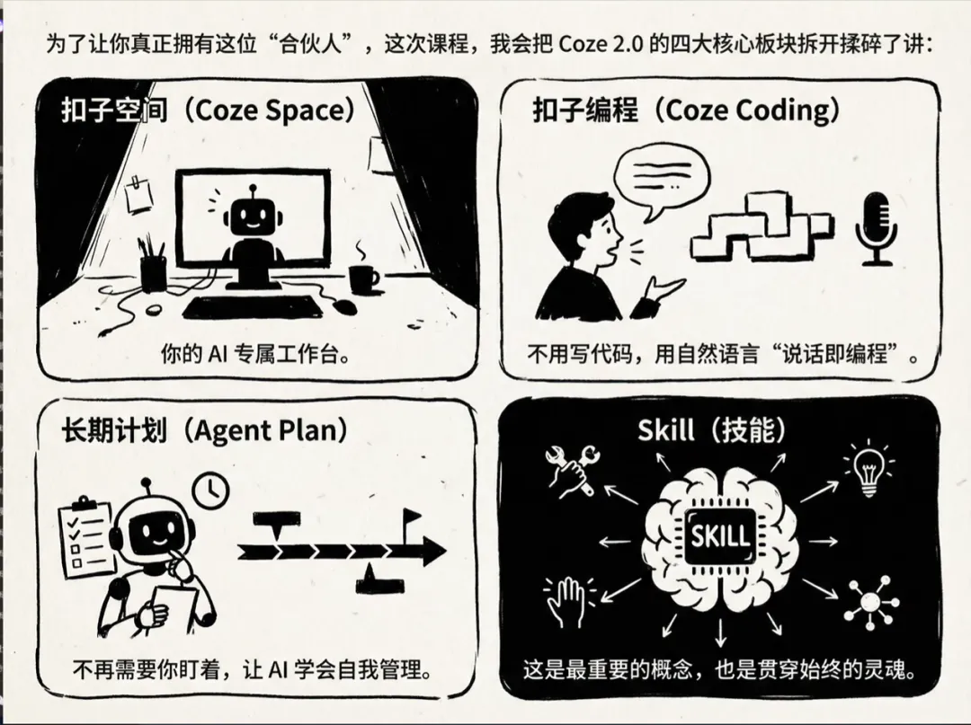 1、不再是一个答题工具,而是一个能持续执行的靠谱合伙人。扣子空间,我理解是不是不用我同时打开豆包写文案,打开即梦做图片,打开小浣熊做表,只要在这里做什么都可以?还不是特别理解,在后面的课程中再看;扣子编程,“说话即编程”,稍微还是有点不信的,就像提示词一样,你说的越精准越细节它才能做的越好,而这个也是门槛;长期计划,这个很有意思,就像有个老师,不仅帮你做好长期规划,还能每天督促你;skill,每一种技能都是一个能力压缩包,那是不是积累的本行业经验也会有用武之地,拭目以待。感谢这位叫麦当的B站博主,不仅课讲的通俗易懂,人还长得帅,没处说理去