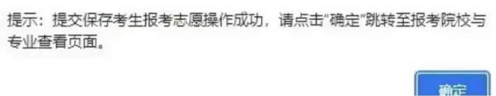 - 保存志愿成功后,进入确认页面,展示信息包括:考生号、姓名、春考专业类别、身份类别、招生类型、报考院校、计划类型、专业志愿、调剂情况。