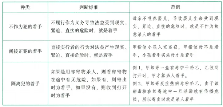 4.着手的判断标准:行为对法益是否造成现实、紧迫、直接的危险。若是,则属于着手。