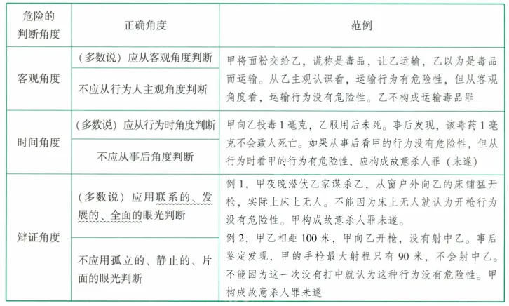 (4)危险判断公式。从客观角度→行为时一般人的角度(联系、发展、全面的眼光)→行为有无危险。