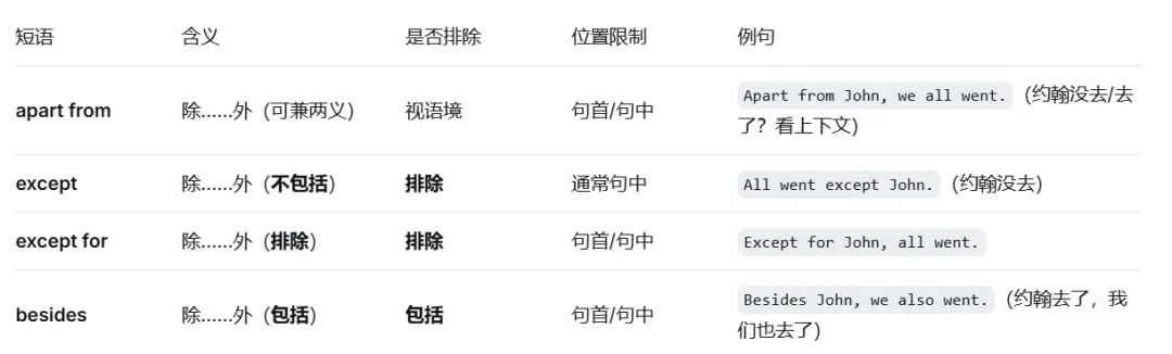 准确区分 apart from 的“包括”和“排除”两种含义,并知道何时用 except / except for / besides。