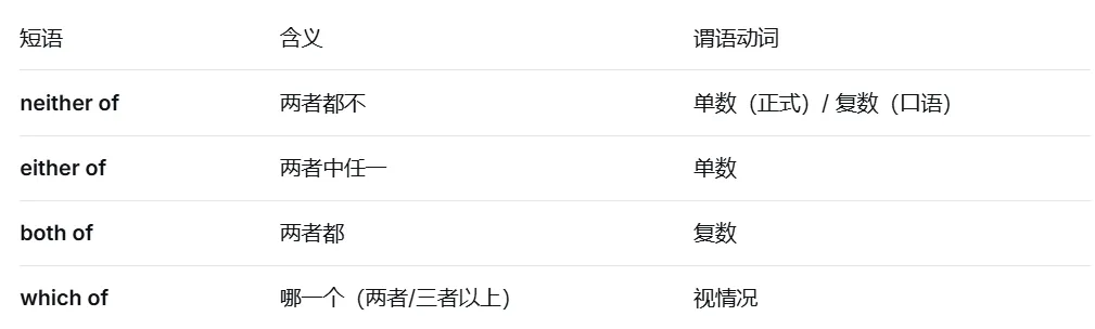 掌握 neither of(两者都不)、either of(两者任一)、both of(两者都)的区别及谓语动词的数。