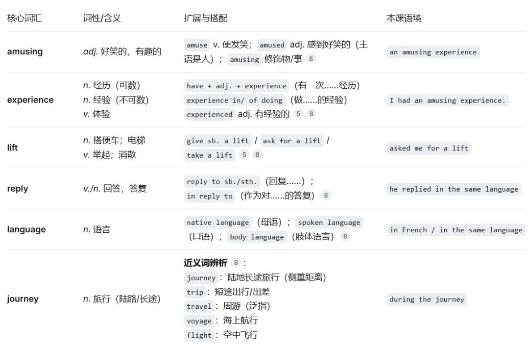 词汇辨析:experience(经历/经验), reply vs. answer, journey vs. trip vs. travel