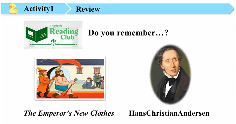 Yes, this boy. The Emperor's New Clothes. Yes, great memory. Thank you. So we read the Emperor's New Clothes.Who wrote the story?Andersen. Yes, and today we are going to read another story by him. (复习上一节课的皇帝新装,引出作者安徒生及今天要学的新课丑小鸭)