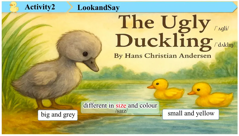 Together, you can say it aloud. The Ugly Duckling. Yes, you know the story very well.So ugly means not so…?Beautiful. Yes and we call a young duck…? Duckling. Which one is the ugly duckling?What do you think? OK, that boy. Which one? On your left or right? Oh, the one on your left, right? How does he look different from the other ducklings?You have sharp eyes. So he is bigger, right? And also the color is different. Yes, thank you. Sit down, please. So these ducklings are small and yellow. But that one is big and grey. Yes, so they are different in…?Size and color. Together, size, size, size. Very good. But is he ugly? Yes or no? Oh, you have different opinions. Maybe the story will give you the answer. (观察图片,初步认识角色)