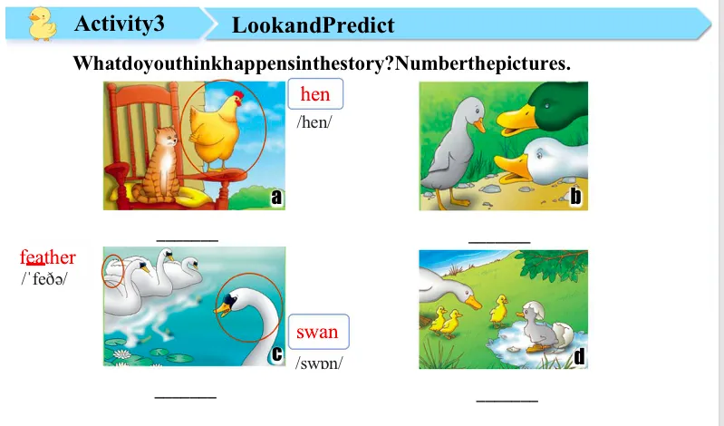 Look at these pictures.What characters can you see?We can see a cat and a hen. Yes. Together, hen, hen. Yes. And in Picture B, we can see the ugly duckling and two…? Birds, maybe. Who is it in pictures C?A swan. Yes, together, swan, swan. What does the swan look like? A swan has a long…?Neck. Yes, and what do we call this?Some white…? Oh, we use the word for animals like cats and dogs, but for birds like swans, we use the word…? Feather. Yes, together, feather, feather. And pay attention to this letter group. OK? Read after me, /e/,/e/, feather, feather. Excellent! And in Picture D, we can see the…? Ugly duckling and three…? Oh, yellow ducklings. Yes, and also some…? Oh, maybe they are her children, yes? So she's the mother duck.