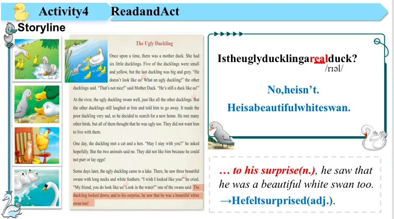 And who can answer this question? Is he a real duck?Yes. What about this boy? So, who is he? Oh, he's a beautiful swan. You are right. And where did you find the answer?In the last paragraph. Can you read the sentence?The duckling looked down, and to his surprise, he saw that he was a beautiful white swan too! I love your reading. You read clearly. Thank you. Please sit down. So what's the meaning “to his surprise”?How did the ugly duckling feel?Yes, the girl. He felt surprised. You are right. Sit down, please. So together, to one's surprise, to one’s surprise. At that time he felt very surprised.