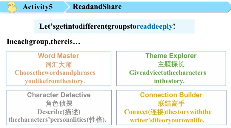 We have one, two, three, four groups in our class. And in each group there is a word master, a character detective, two sing explorers and also two connection builders. So who do you want to be? You can choose one from the task cards on your desk.