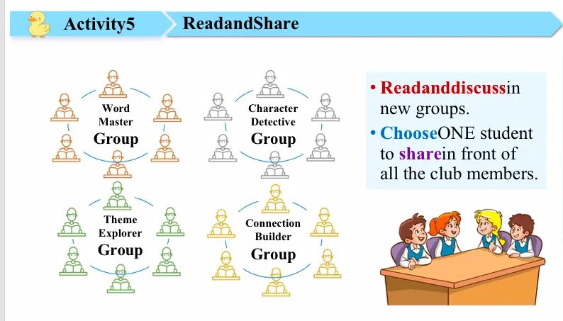 All right, time is up. Boys and girls. I'm so glad to see all of you work hard on your task cards. So let me ask some students. Maybe this girl,so can you tell me who are you? You are the…?Oh, word master. Thank you. So which word do you like?I love the phrase, to my surprise. A very good phrase, to one's surprise. But do you want to share it with other word masters?Yes. And do you want to learn more useful words and phrases from them?Yes. OK. Good. Maybe you can discuss it with other word masters later. And how about? Yes, I see this girl. You are not sure about something. So what's your problem? Can you tell us? I don't know how to give advice to the ugly duckling. You are not sure about your advice for the ugly duckling. So do you want to get help from other theme explorers?Yes. So you can ask for their help, right? Thank you. So now, you can change your seats like this. Take a look. So here, the word master group, the character detective group, the theme explorer group and the connection builder group. Now go. Change your seats. Finished? Right? OK, take a look here.