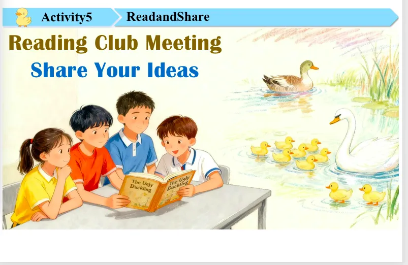 And in the end,he met some beautiful…?White swans. Yes. Were they friendly to the ugly duckling?Yes, I want to ask students here, the girl, please. Oh, they were friendly. Why do you think so? My friend, you do look like us! Look in the water. You just read the line of the one here, right? Thank you. Sit down, please. Very good.