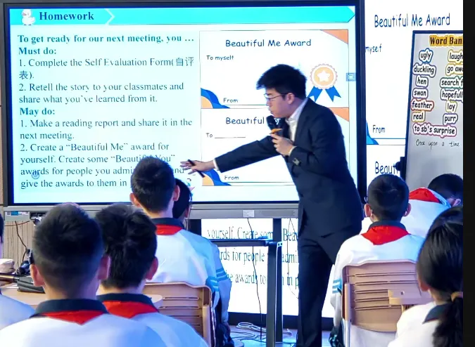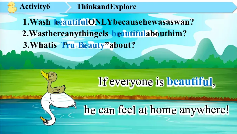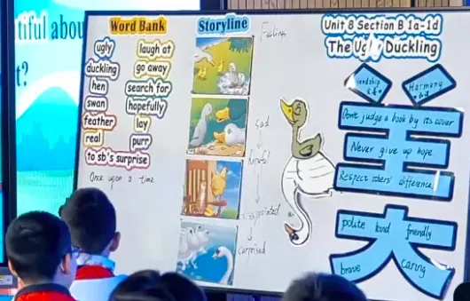 OK. So I agree with all your ideas and I think if we keep friendship in our hearts, then the world will be in harmony. Yes, that makes the true beauty. Thank you as well for cheering me up, right? OK. And if everyone is beautiful, the ugly duckling can feel at home anywhere. Understand? Yes, so this is what we hope.(灵魂拷问,育人价值再次体现;同时板书设计上的创新--将汉字美与主题意义探究相融合,学生们“哇塞”的惊叹是对这节课的最佳褒奖,不愧是一节既有温度又有育人情怀的课)
