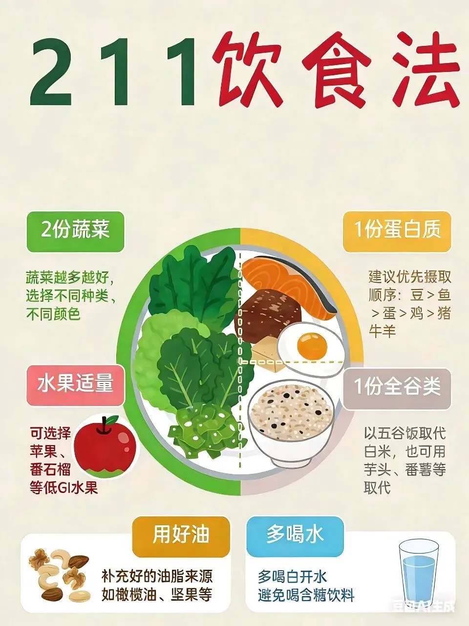 合理分配每餐摄入量:少食多餐,避免血糖剧烈波动。选择低升糖食物,结合211饮食法则。