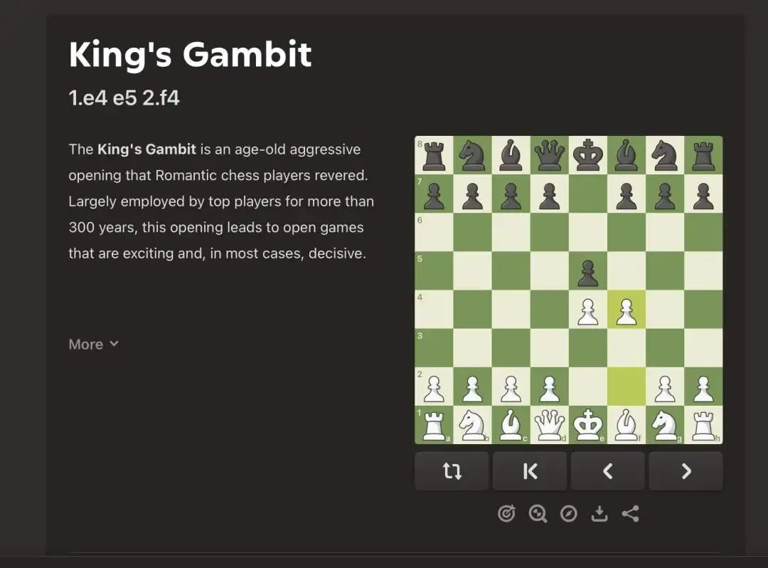 目前感觉King's Gambit开局还是非常新手友好的,对局质量主要取决于:1)能否在每一步找到最优解,2)对手能力-只要不是超级大佬,在自己意识清楚的情况下基本很容易赢。