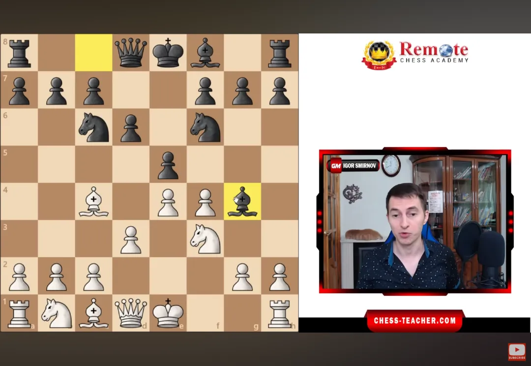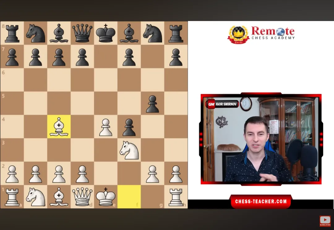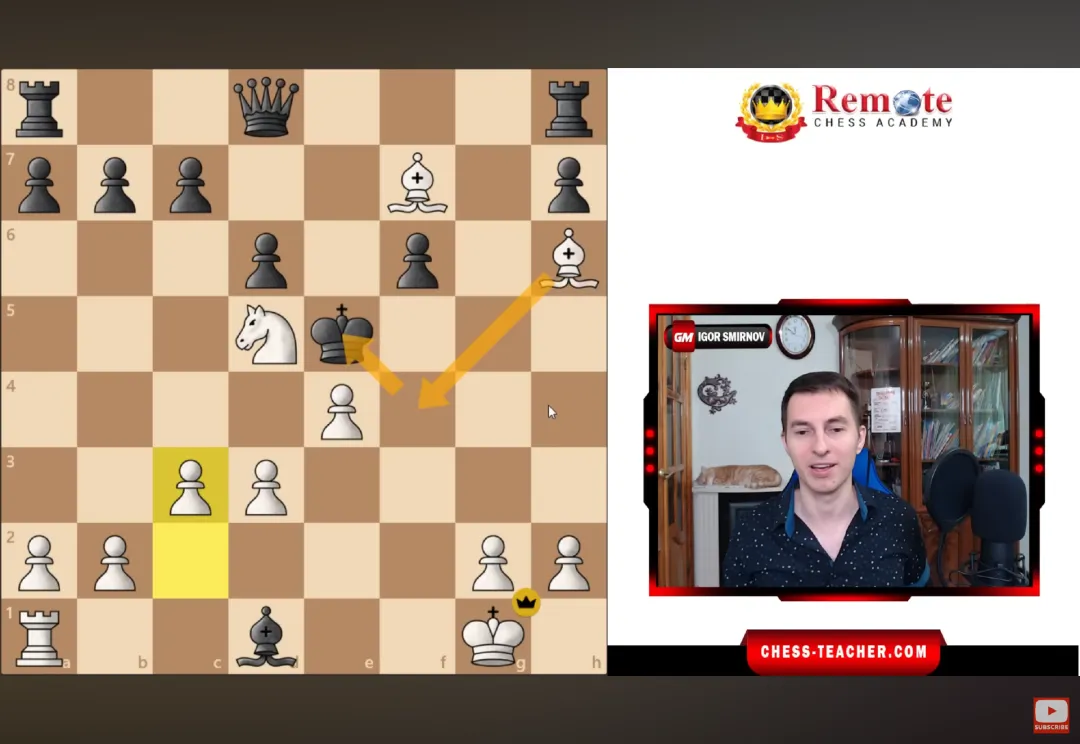 接下来通常黑方会把马冲上到到d4,但此时不要害怕,因为它看似要攻击的f3马和c2兵,实际都在保护下且trade可控,所以不用管这个马,继续用c4象和f4兵向前突破。